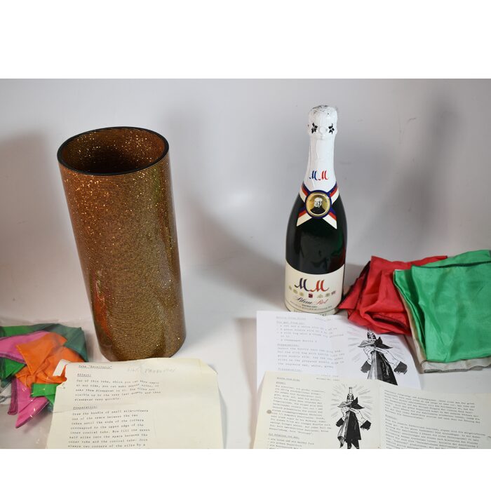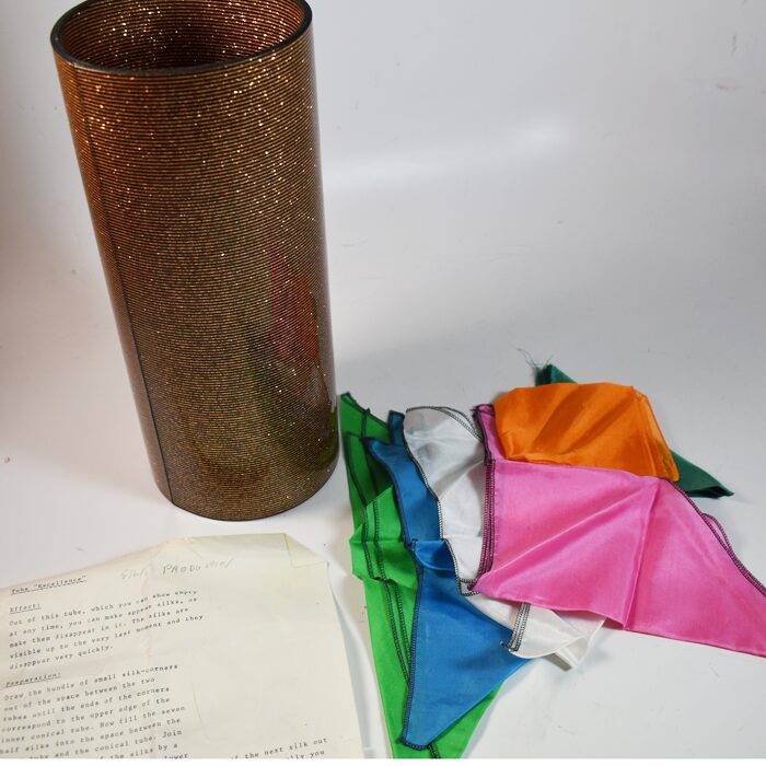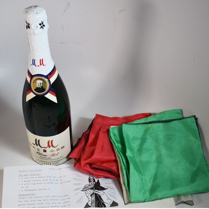 Two items from the German Company Magic Hands: The bottle from silks and Tube Excellence. You produce a full size Champaign bottle from empty silks. In the Tube Excellence you show the tube empty and then produce silks form the tube. You then show the tube empty and the silks actually placed in the tube still protruding from the tube. When you toss the tube into the air the tube comes down empty and is clearly shown to be!