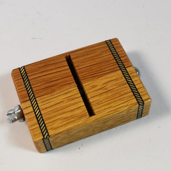 Effect: A solid brass bolt, threaded through a sleek wooden holder, is shown to be impenetrable. A borrowed coin, marked by a spectator, is placed beneath the holder. With a magical twist, the coin impossibly penetrates through the solid bolt and holder, landing on the table in full view! The coin, bolt, and holder are fully examinable, leaving audiences stunned by the clean, visual miracle. Fancy wood inlay version and the scarce silver dollar size.