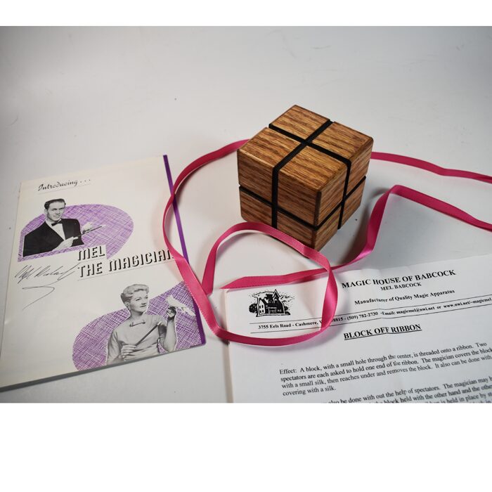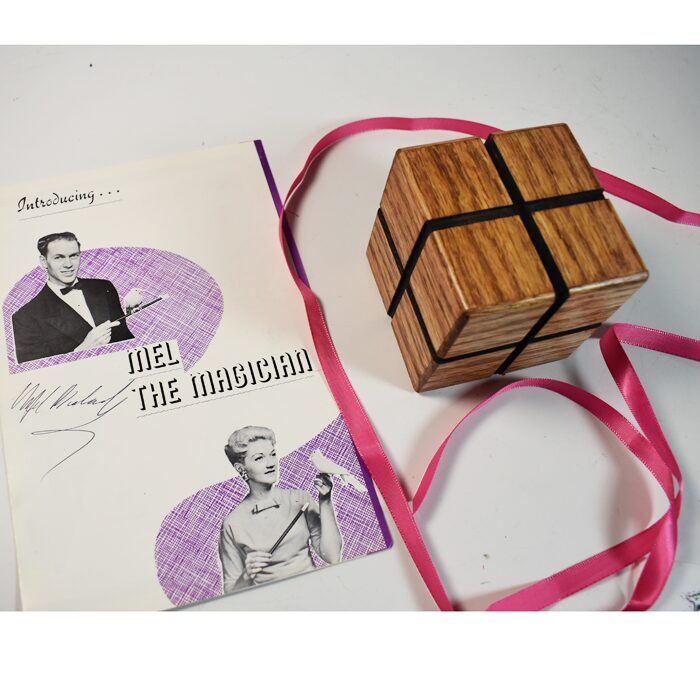 This is a gimmicked block that has a spring loaded center section which allows a ribbon or cord to pass through the block and then it springs back into place closing the opening. I believe Riedel made the original version and this is Mel’s take on it. When we opened the packing box Mel had included this early “Mel the Magician” brochure so we are including it in the auction. A scarce item from Mel. The block is 3 inches.