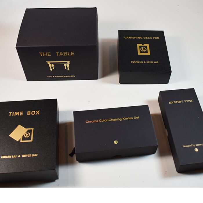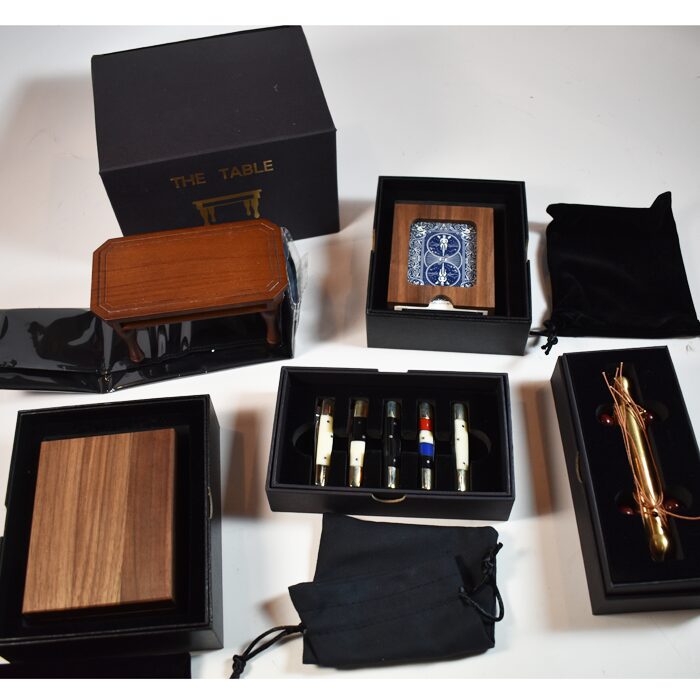 Great group of new magic from TCC: Time Box, Color Changing Knives, Mystery Stick, Vanishing Deck Pro, The Table. All brand new complete in the original box.