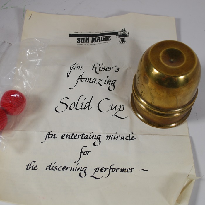 From Sun Magic in 1973. This is a chop cup type routine that ends with a solid brass cup that weighs 6 pounds! That is right. 6 pounds! Comes with original instructions and is highly collectible as it is extremely scarce in this large size. Requires some slight of hand ability if you are going to perform it Great addition to any cups and balls or chop cup collection. Can be polished if you wish but I have left the original patina. Try to find another!