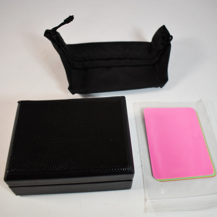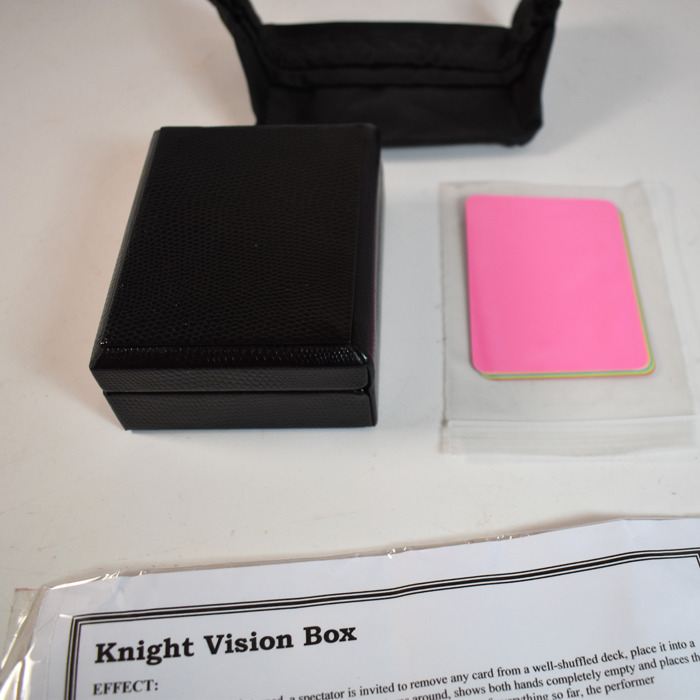 While the performer’s back is turned, a spectator is invited to remove any card from a well-shuffled deck, place it into a slot inside the box and close the lid. The performer now turns around, shows both hands completely empty and places the box into a drawstring bag in full view of the spectator. Despite the fairness of everything so far, the performer immediately announces the name of the chosen card without asking a single question!