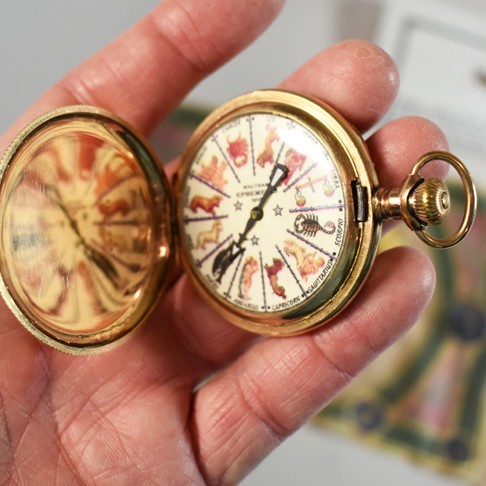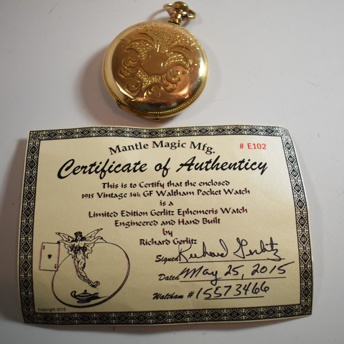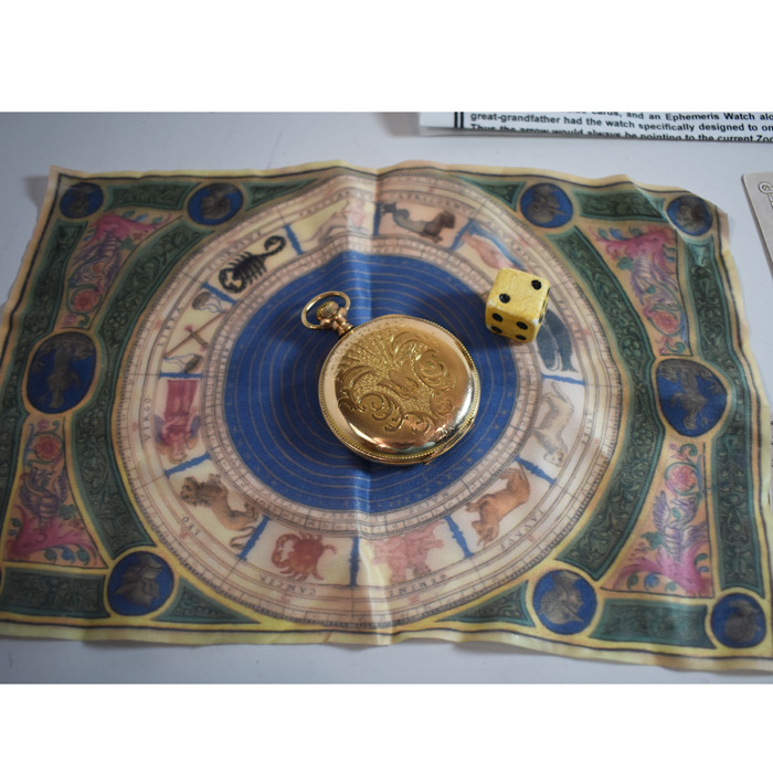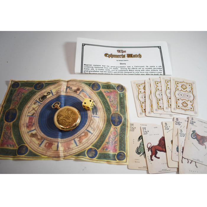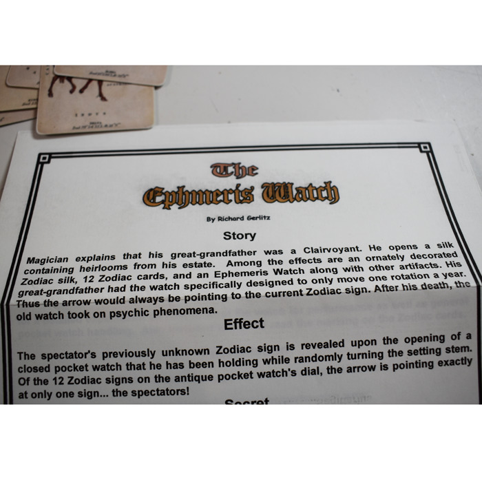 In its simplest form, and antique 14k clad pocket watch is handed to a spectator and they are asked to close the cover and give the watch hands as many turns as they would like. The watch can then be opend by the spectator to revel they have selected their zodiac sign. I invite you to visit the Gerlitz Ephemeris Watch web page here.