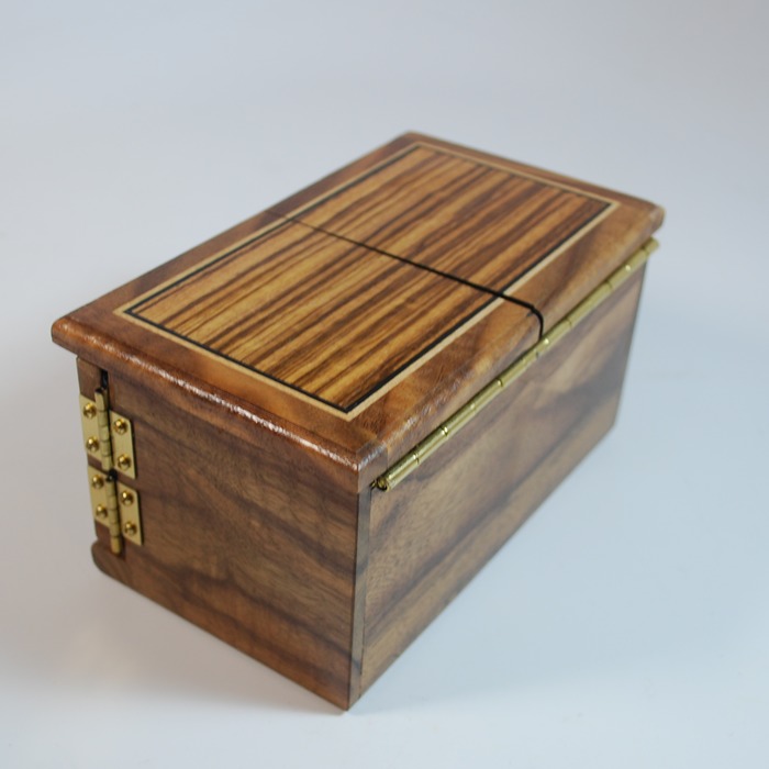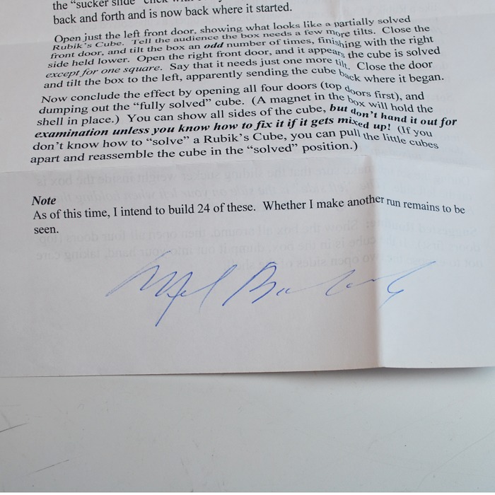Not your average die box. The box is made to solve the Rubik Cube Puzzle! The mixed up cube is placed in the box. It is then slid from one side to another. The box is opened and the cube is only partially solved. It is then slid again and the door opened and the cube is solved except for one piece. The door is closed again and the cube slid. The door is again opened and the cube is totally solved! All four doors are opened and the cube is dumped out into the hand leaving the box obviously empty!