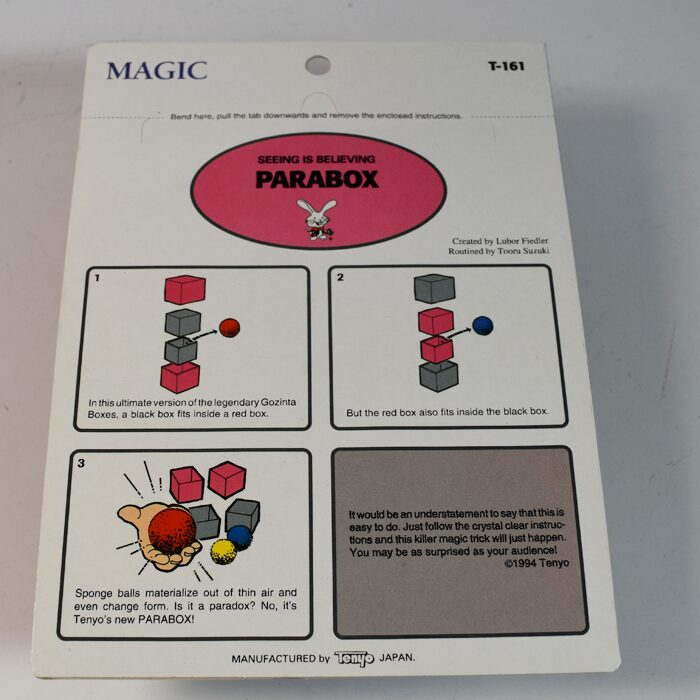 “It would be an understatement to say that this is easy to do. Just follow the crystal clear instructions and this killer magic trick will just happen. You may be as surprised as your audience! Sponge balls materialize out of thin air and even change form. Is it a paradox? No, it is Tenyo’s PARABOX!” Created by Lubor Fiedler, routined by Toru Suzuki. Discontinued by Tenyo. In original unopened blister pack New condition.