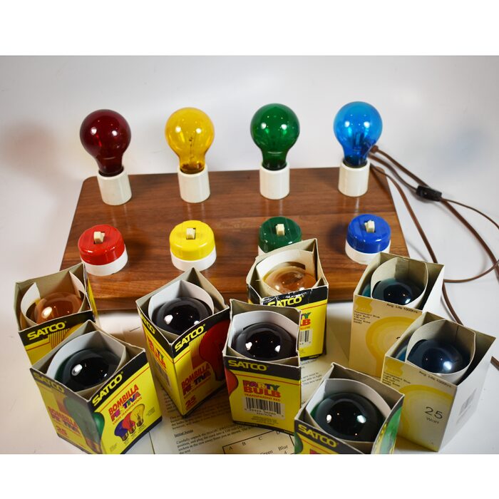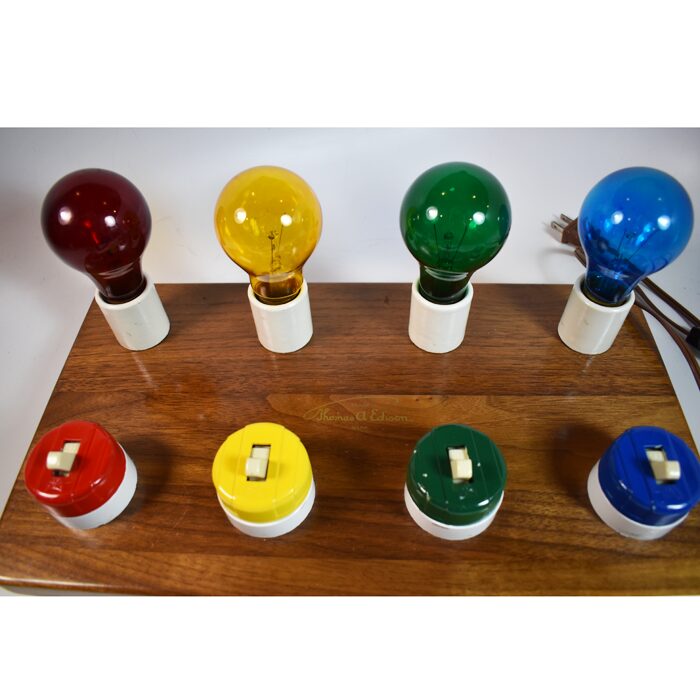 A finely finished walnut board is shown to have four differently colored light bulbs, each with a switch of the same color in front of it. When the red switch is turned on, the red bulb in front of it illuminates. As each switch is turned on, the correspondingly colored bulb in front of it lights. Nothing special so far. Now in an attempt to confuse the spectator, the first two bulbs are removed from their sockets and their positions reversed, so that they no longer line up with their matching switch. Even so, each switch still operates only its matching colored bulb. Throughout the routine, all the bulbs are moved around and still, each switch operates only the bulb matching its color. Finally, with all the bulbs mixed up, the performer explains that it was better with all the bulbs in front of their respective switch. Rather than unscrew all the bulbs, there is a faster way to straighten things out. The colored cap on each switch is removed and replaced in front of its matching bulb. Again all switches are turned on and each colored switch operates only its matching bulb.
