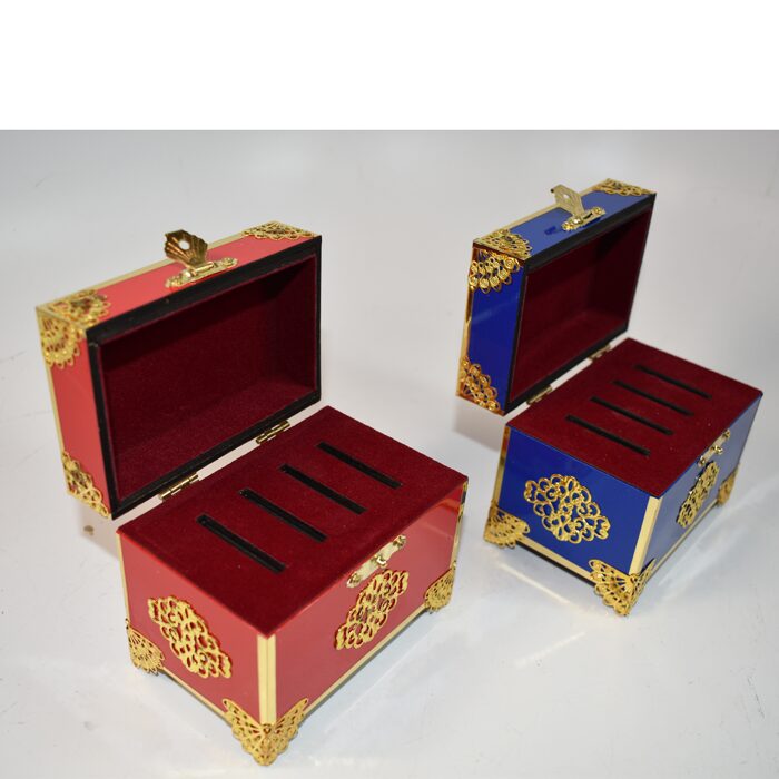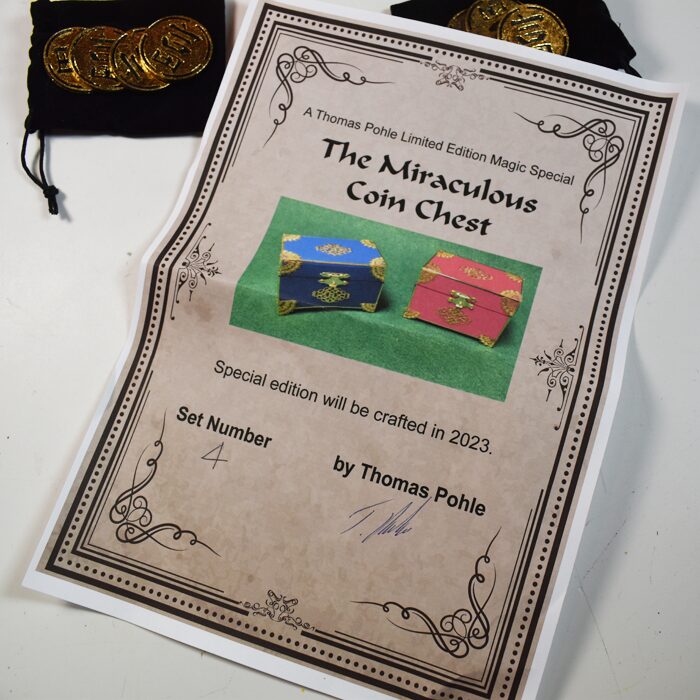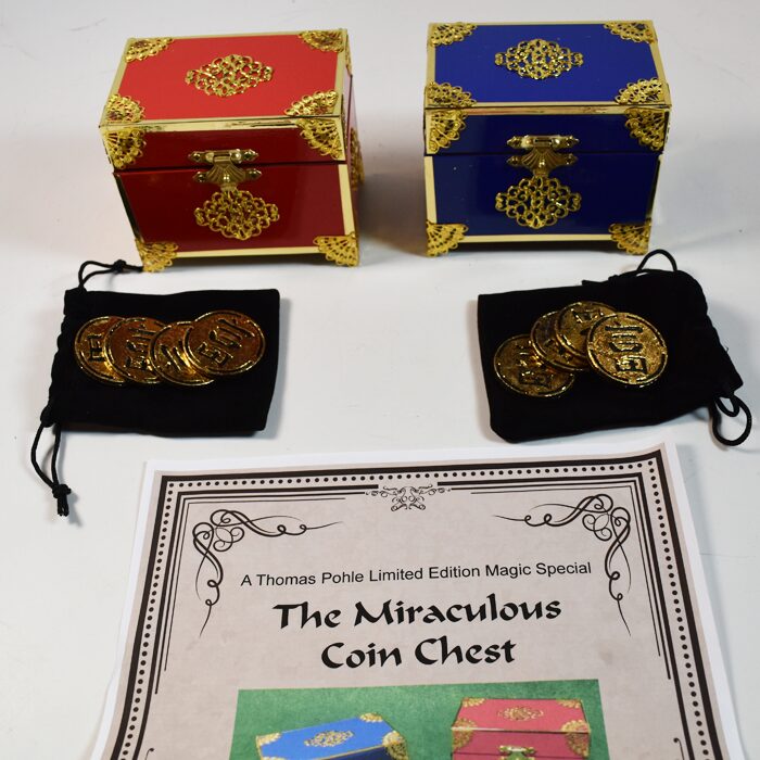 What a beautiful set of boxes. The coins vanish from the red box and reappear in the blue box. The coins are under your control at all time. You can select which coin vanishes and which reappears. One coin at a time or multiple coins can vanish or reappear. All under your control. When the coins vanish there is a slide that comes over the opening hiding the works. This is wonderful outfit and very few were made. This is number 4. It is unlikely you will see this any where else for sale. A certificate of authenticity signed by Thomas is included. You get a link to the video explanation of the workings. Boxes are 4×3.5×2,5 inches, Rare, New opened to photograph.
