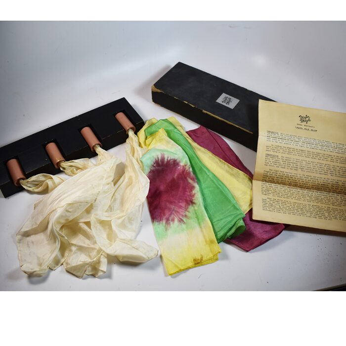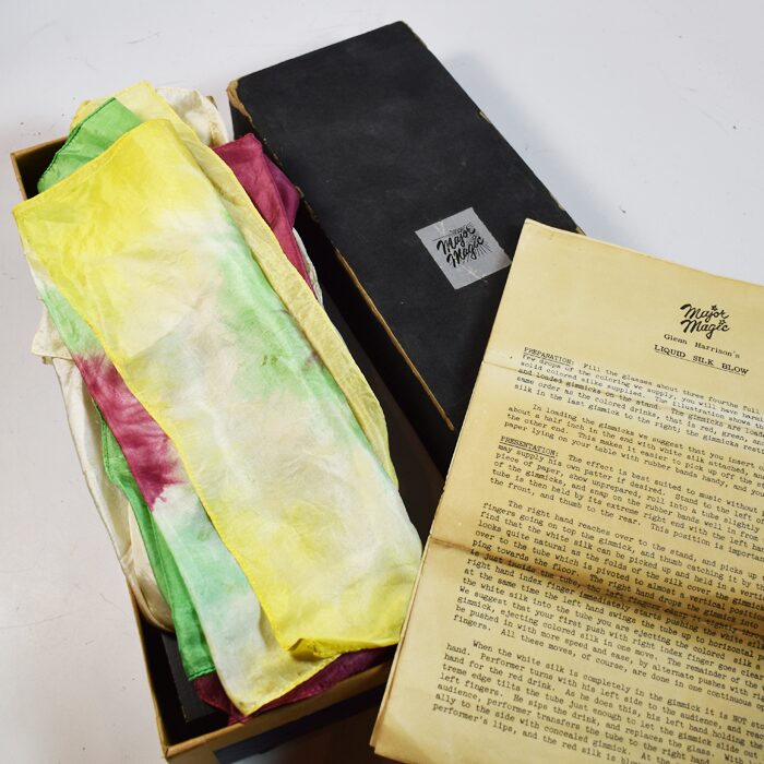 One of the prettiest effects in magic. You have three glasses with three different color liquids. You show a white handkerchief and place it into a just formed paper tube. You take a drink of the liquid and when you blow the silk flies out and is now the color of the liquid! This is repeated two more times. The fourth time you take a drink of each liquid and the white silk flies out and is a rainbow of the three colored drinks! In the original box with original instructions.