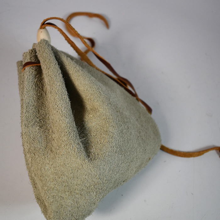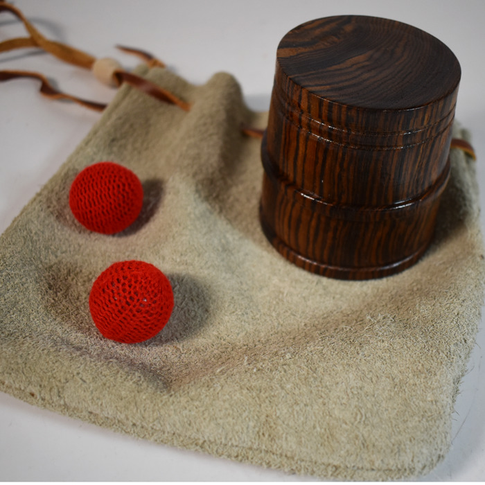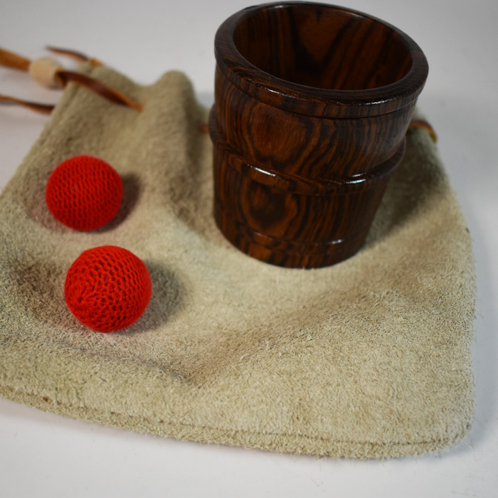 Cup is 3 inches tall and 3 inches in diameter. Nice heavy suede carry bag and two crocheted balls. Excellent.